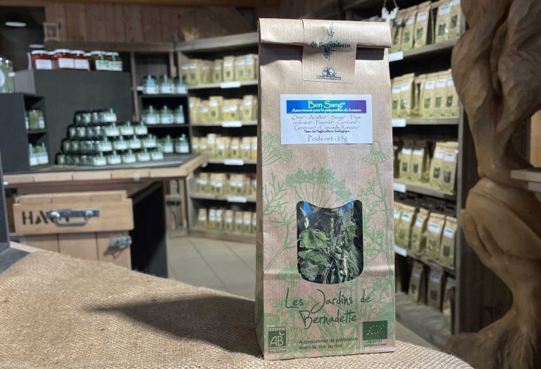 Assortiment « Bon Sang » composé d’Ortie, Achillée, Sauge, Thym ordinaire, Pissenlit, Gentiane, Genévrier, Camomille Romaine conditionné en sachet Kraft. Poids net 25 g.